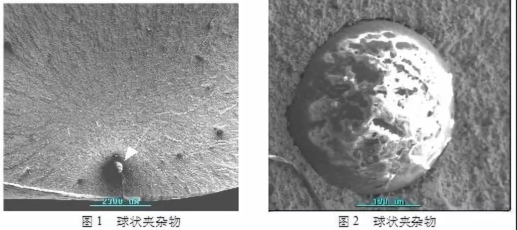 實例:某公司一件型號為SY6480(Ф22mm)的車輛懸架用扭桿彈簧,在新車出庫時便發生斷裂,分析認為斷裂起源于彈簧亞表面存在的一個粗大脆性夾雜物(如圖1,圖2(圖1的放大圖))。