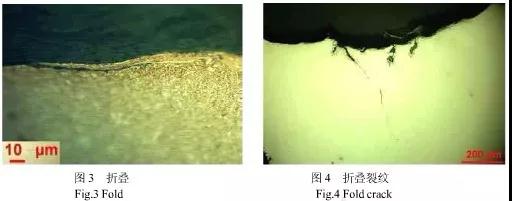2、軋制過程可能引起的缺陷:殘余縮管及中心裂紋;折疊缺陷(如圖3);線狀缺陷、劃痕;表面銹蝕坑;過燒、桔皮狀表面、麻坑;這些都可能導致彈簧失效。所以鋼廠應盡量避免和消除軋制過程中產生的缺陷,彈簧廠應加強對彈簧原材料質量檢查,盡量采用表面質量好的材料。