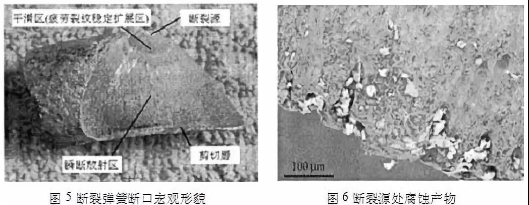 實例:對某電廠汽輪機主汽門操縱座彈簧的斷裂失效進行了分析。結果表明:彈簧材料化學成分及組織都符合國家標準,導致其早期疲勞斷裂的主要原因是彈簧表面的腐蝕坑(如圖5,圖6);腐蝕坑是在彈簧使用前的放置過程中形成的,改善彈簧放置環境和縮短放置時間可以避免腐蝕坑的產生。
